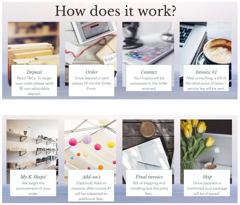 My K Shopper is a personal shopping business based in South Korea, Seoul. We are a small start-up and seeing the possibilities of where this journey will take us! We offer personalized shopping to each client with tailored attention they deserve as we help with their every shopping need.